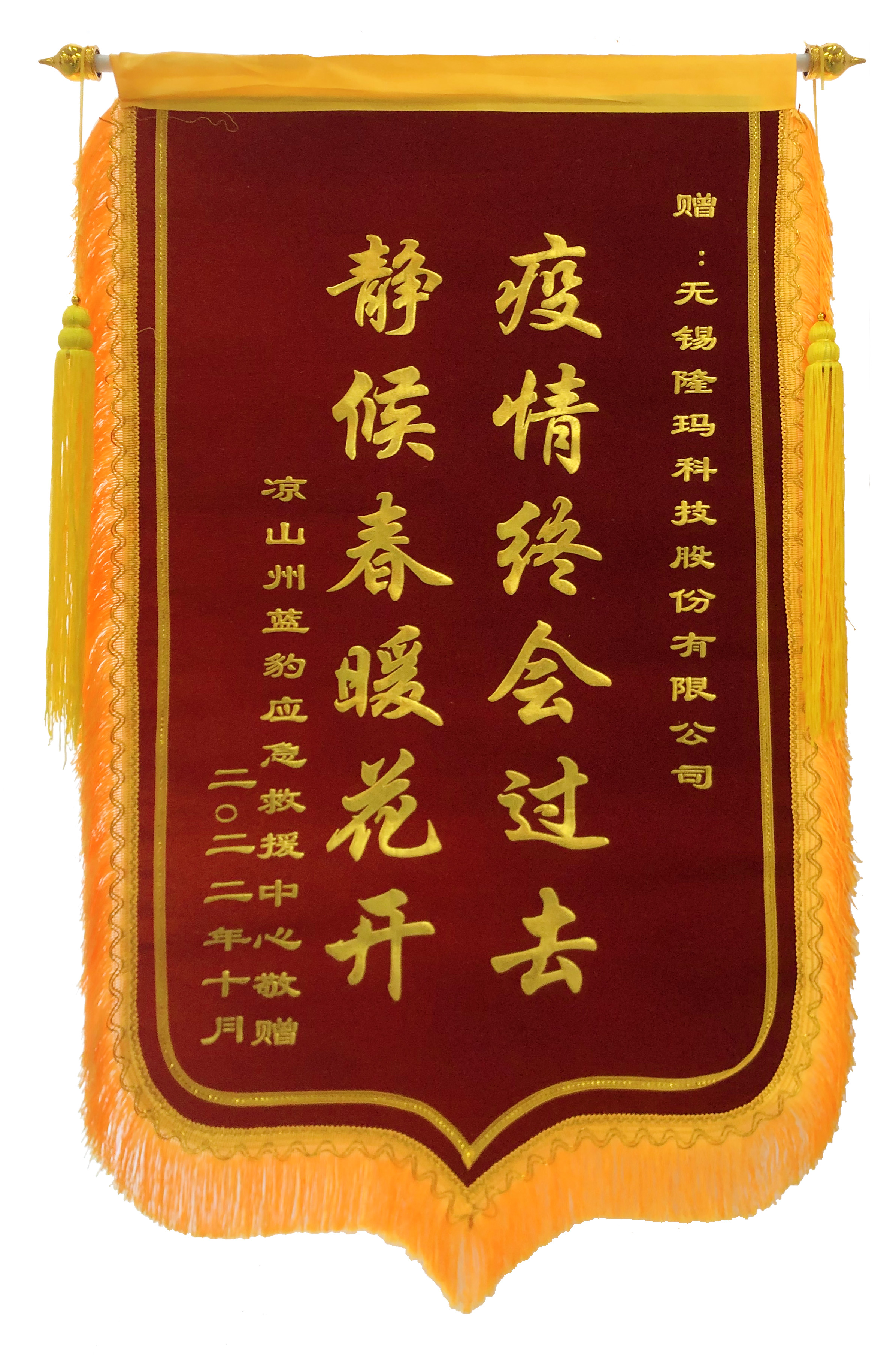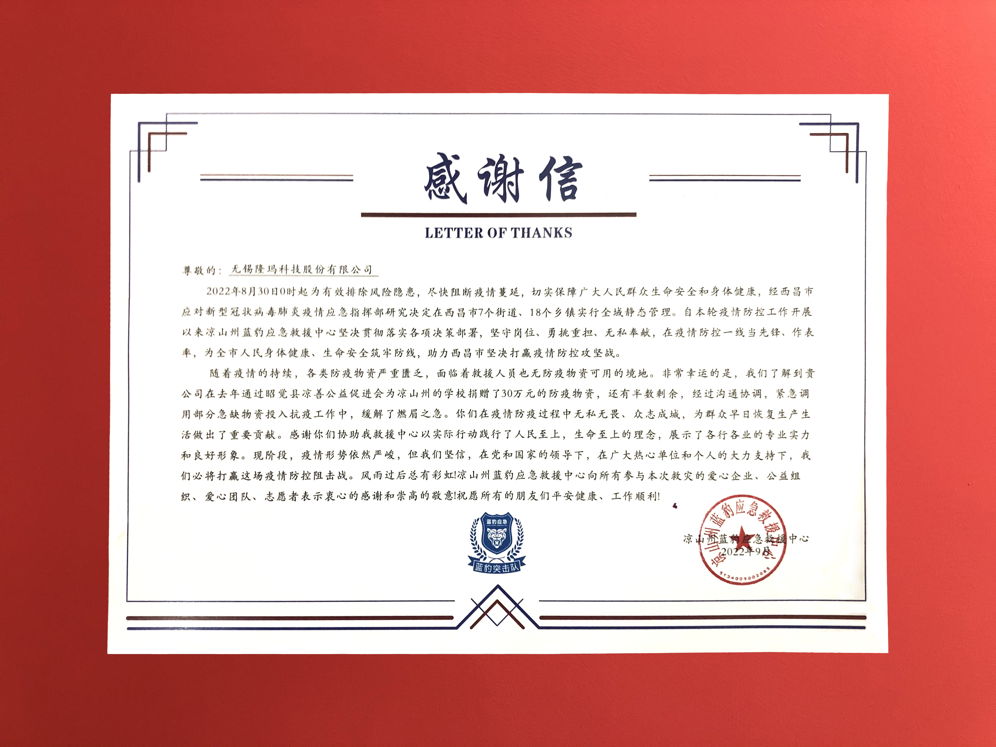 近日,無錫隆瑪科技股份有限公司董事長楊朝輝收到來自四川省涼山州藍(lán)豹應(yīng)急救援中心寄來的感謝信和錦旗,對公司在疫情防控中無私無畏、眾志成城、為群眾早日恢復(fù)生產(chǎn)生活做出的重要貢獻(xiàn)表示感謝。